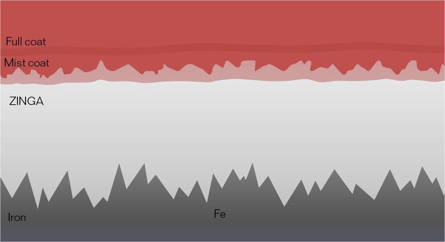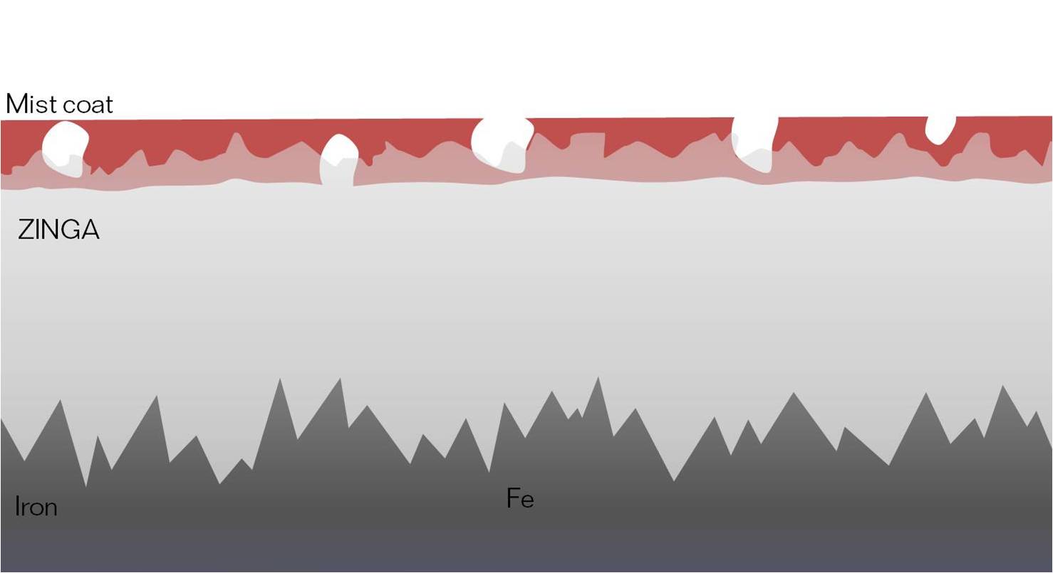 Uma camada fina de selante ou topcoat é aplicada sobre a superfície de ZINGA®, antes de fazer a passagem completa do revestimento com a espessura normal. Esta película fina penetra apenas nas camadas superficiais do ZINGA® e sela a sua superfície. Sendo, também, relativamente “porosa”, a camada em névoa oferece pouca resistência à passagem do ar, a partir destas camadas superiores.